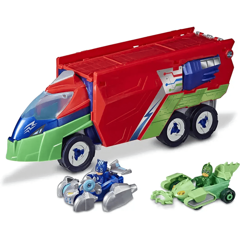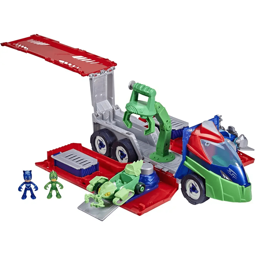 Questo fantastico veicolo 2 in 1 si trasforma in stazione di lancio a doppio veicolo e laboratorio di personalizzazione auto PJ Mask