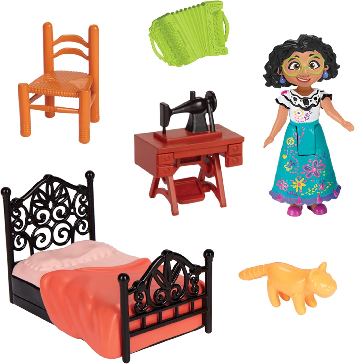 Include 1 personaggio, una sedia, una macchina da cucire, 1 giaguaro e 1 fisarmonica