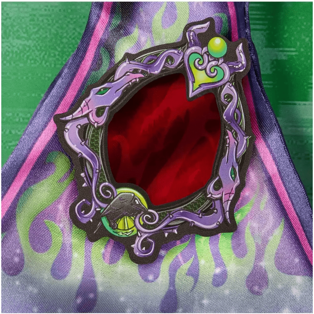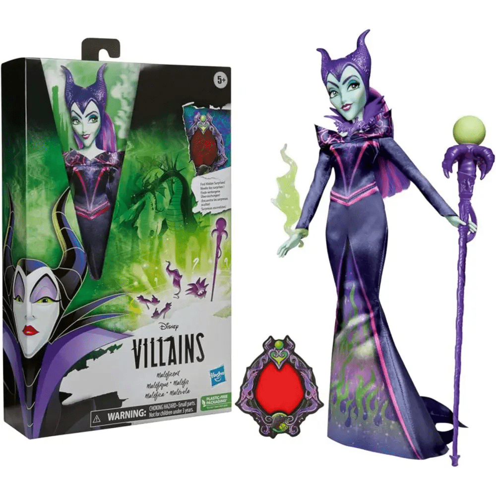 Il suo lungo abito, decorato con motivi a forma di fiamma, aggiunge un tocco di mistero e maestosità al suo look regale, catturando l'essenza del personaggio in modo mozzafiato. Ma ciò che rende questa Malefica ancora più speciale sono gli accessori esclusivi e la speciale lente inclusa, che permette di rivelare immagini nascoste nel suo vestito. Questo dettaglio aggiunge un elemento interattivo e intrigante alla bambola, rendendola un vero e proprio tesoro per i collezionisti e gli amanti dei dettagli.