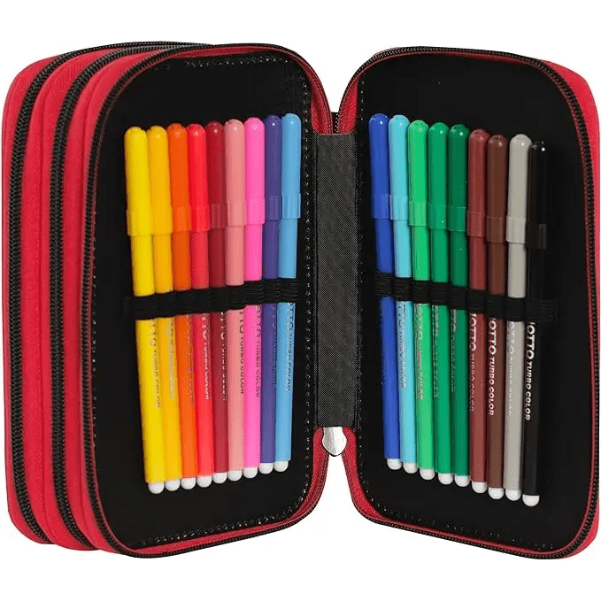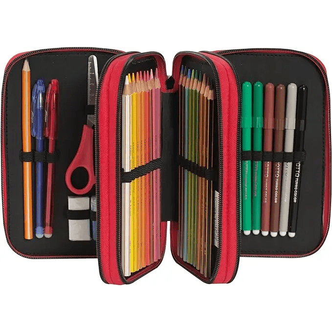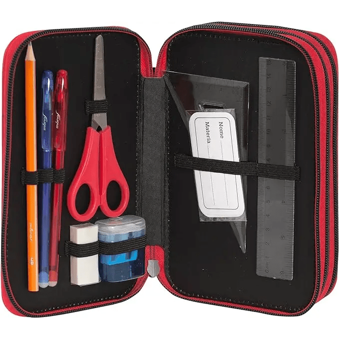Al suo interno trovi: 18 matite colorate Fila, matita,18 pennarelli Giotto, gomma, penna rossa, penna cancellabile blu Frixion, righello, temperino con serbatoio, forbici con punta arrotondata, squadra ed etichette portanome