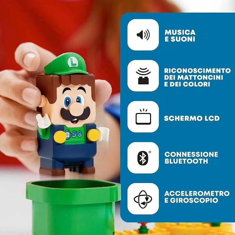 Il personaggio di Luigi è dotato di schermo LCD e altoparlanti che gli permettono di mostrare diverse reazioni che si attivano quando entra in contatto con i mattoncini color "torrone". E' anche possibile guadagnare monete digitali per nuove divertenti sfide.