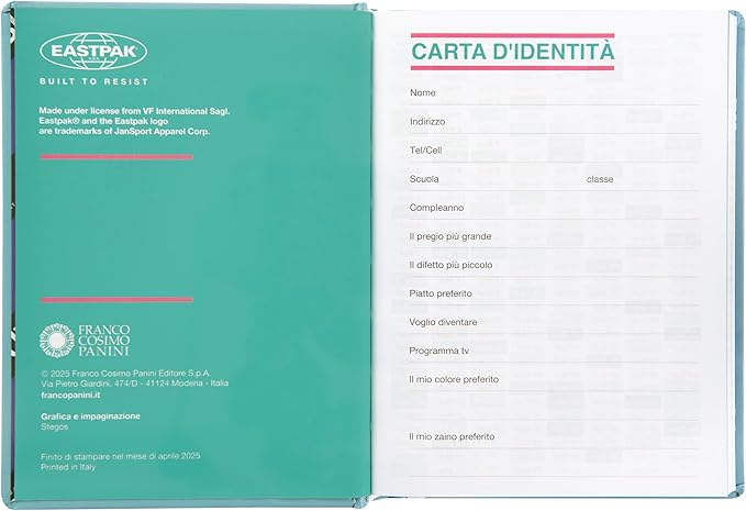- DIARIO SCUOLA EASTPAK: Questo diario Eastpak 13 mesi, dal 1° settembre 2025 al 30 settembre 2026, è ideale per prendere nota di compiti, verifiche, interrogazioni e molto altro. Il prodotto è distribuito da Franco Cosimo Panini Editore con licenza originale di Eastpak