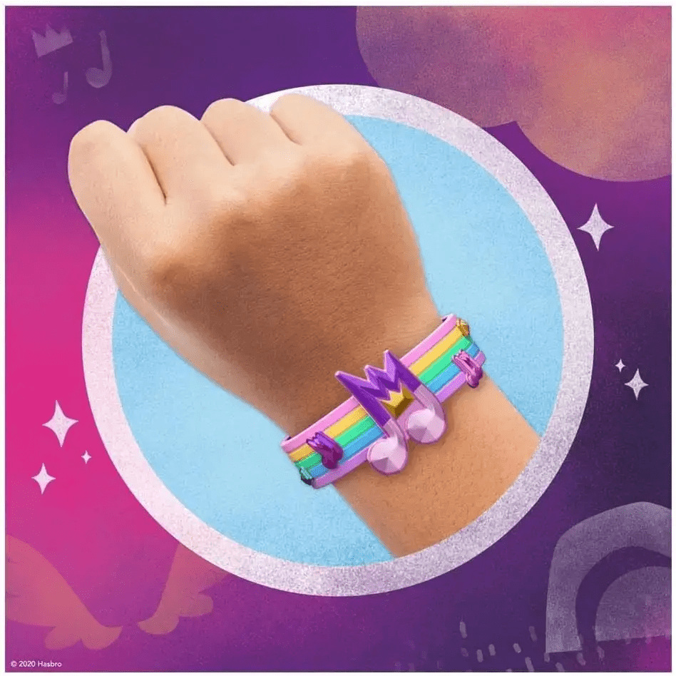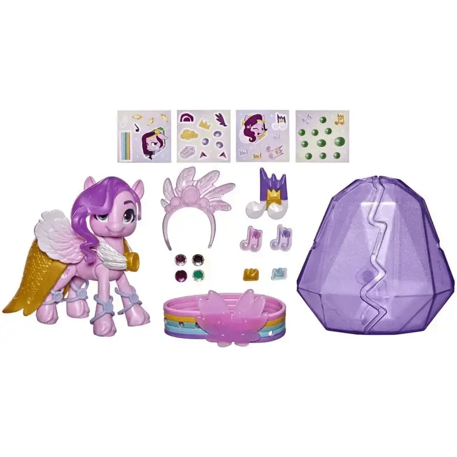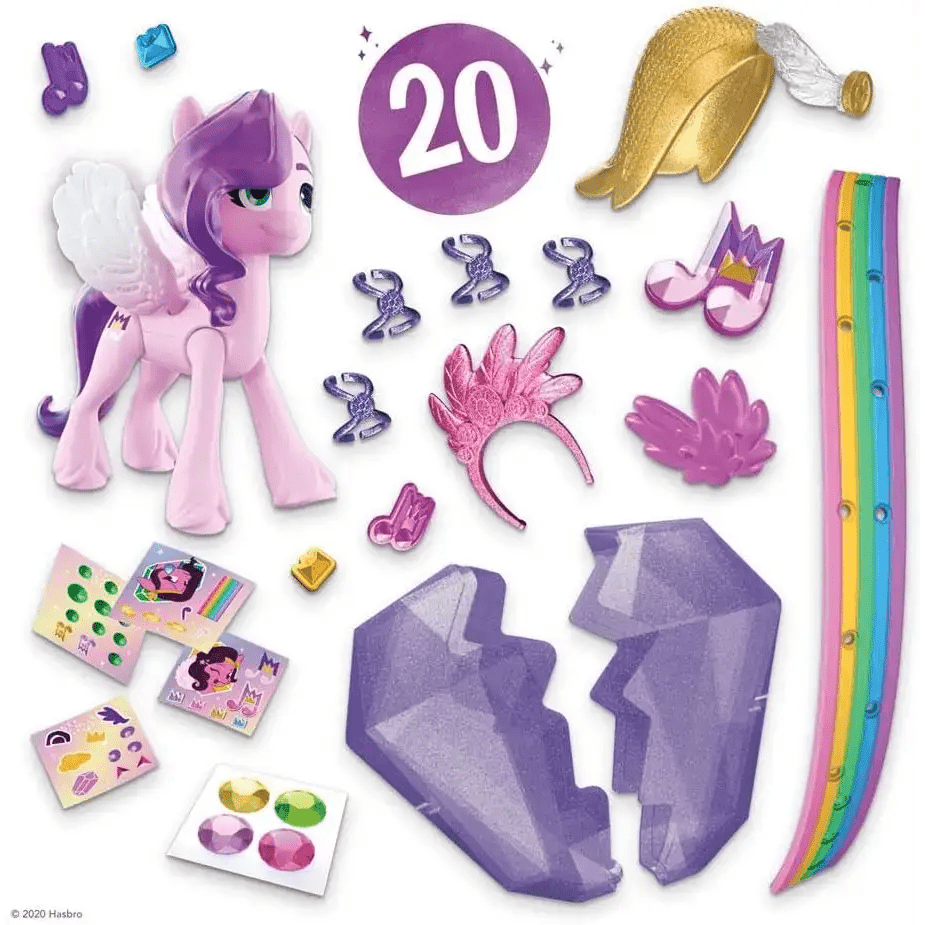 Questo set contiene 20 sorprese: un pony, contenitore a forma di cristallo, braccialetto dell'amicizia, 7 charm, 4 fogli adesivi, vestito, cerchietto, 4 scaldamuscoli e un tatuaggio per bambin