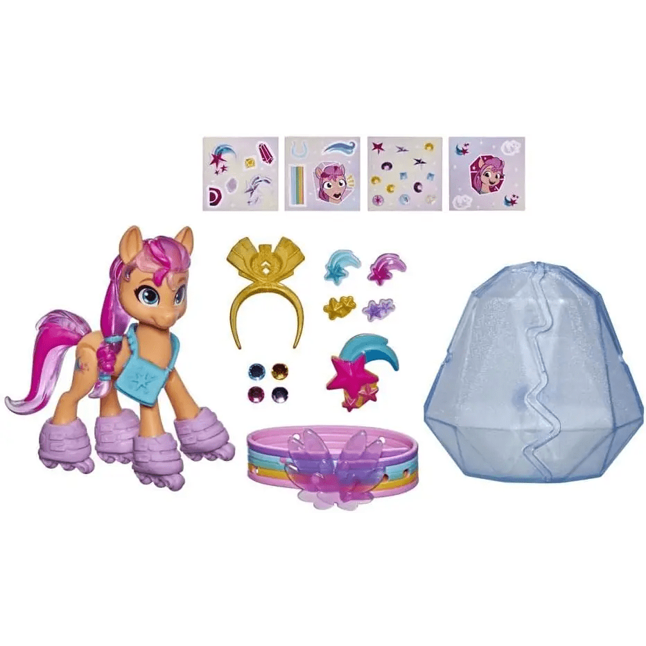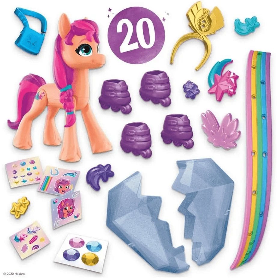 Questo set contiene 20 sorprese: un pony, contenitore a forma di cristallo, braccialetto dell'amicizia, 7 charm, 4 fogli adesivi, corona, borsa da sella, 4 pattini a rotelle e un tatuaggio per bambini