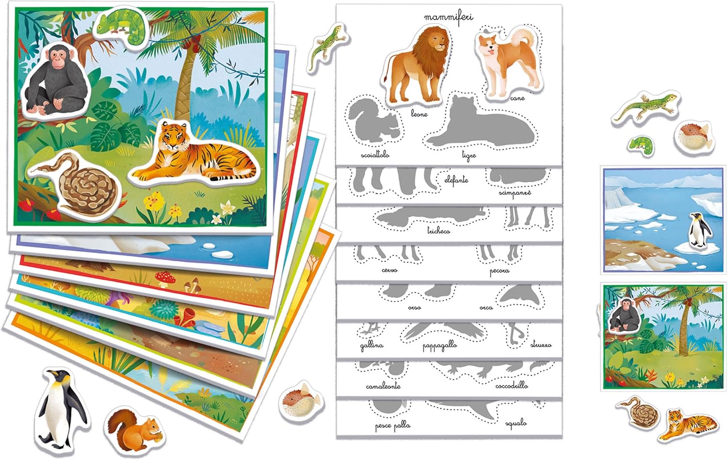 Ogni scheda rappresenta un habitat naturale — mare, giungla, savana, foresta, polo e campagna — in cui il bambino può riconoscere e collocare gli animali corrispondenti.