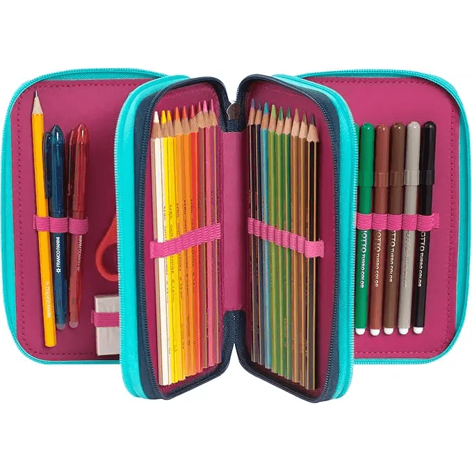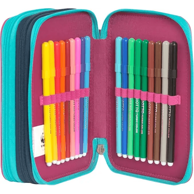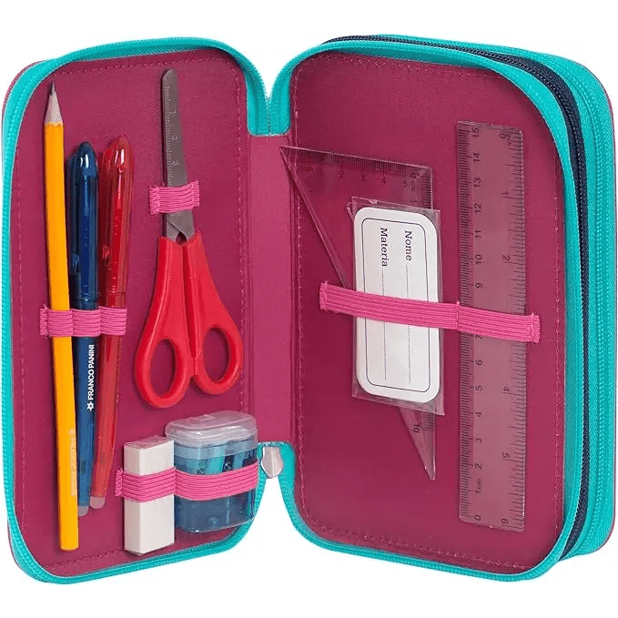 All'interno di questo astuccio a 3 scomparti, sono contenuti 46 pezzi di cancelleria: 18 matite colorate Fila, 18 pennarelli Giotto Turbocolor, matita, gomma, righello, temperino, forbici con punta arrotondata, goniometro, squadra, evidenziatore, penna rossa e penna cancellabile Frixion blu.